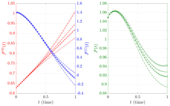 Finally, in Figure 9, we show the total force exerted by the fluid on the plate; see Remark 2. We noticed that increased with time, while exhibited the opposite behavior. The total force at the first order slightly increased at the beginning and then decreased with time. The correction at the first order in this case seemed to be quite relevant.