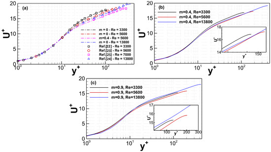 In Figure 1a–c, curves of have been plotted along for all three cases of , while the viscosity ratio parameter, m, has been varied for and as well. Results of these cases present a particular interest, as two different trends can be detected. The first one concerns the comparison of cases with the same and different viscosity ratio m. By closely examining the results presented in Figure 1a–c, it is understood that the normalized streamwise velocity, , collapses to lower values as m increases, indicating higher turbulence activity. This observation holds true, according to the present results, for all three . In the latter case of constant viscosity ratio m and different , a peculiar behavior can be observed. When viscosity ratio , curves of collapse again to lower values as increases, as anticipated. On the opposite side, though, for higher values of m and more specifically when , curves of present a non-monotonic behavior, where they collapse to lower values as increases from to and then to higher ones for , indicating turbulence attenuation.