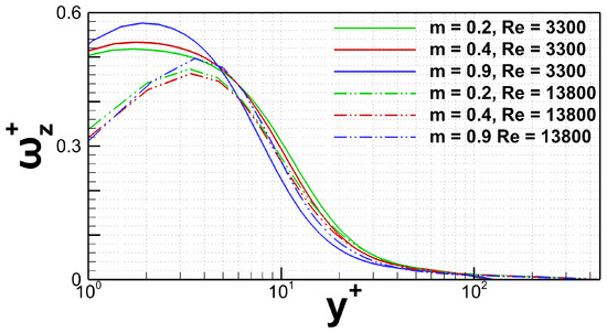 The observation above is further enhanced by examining results of the normalized micropolar velocity, , which has been plotted in Figure 4 along for various m and . In order to keep the results presentation comprehensible, only two values of have been selected to be presented here (), along with three different values of the viscosity parameter ( and ). Mean value of micropolar velocity survives only in the spanwise direction and is of the same nature as vorticity, but in an active way representing an additional force acting on the flow. The fact that for higher , normalized micropolar velocity drops to lower values, while at the same time moves away from the wall, not only enhances our previous findings, but also adds more information. Essentially, this leads to the conclusion that the additional micropolar force suppresses near-wall turbulence and leads turbulent activity away from the wall.