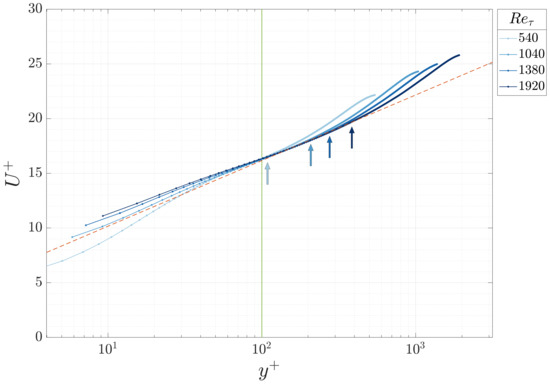 Figure 4 presents profiles of the smooth-wall mean streamwise velocity, scaled in inner units (i.e.,