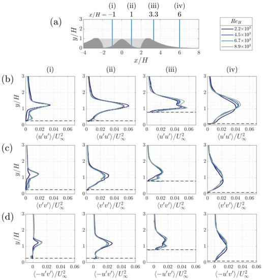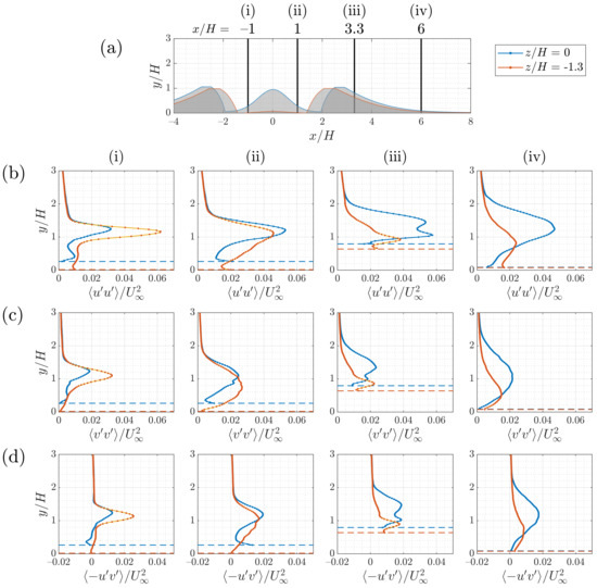 are positioned in the near-wake region. Two peaks emerge in all profiles at this location, suggesting an additional flow separation and an interaction between two distinct shear layers, with an increase in magnitude with