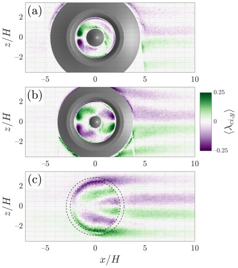 37]. To aid in identifying larger-scale instantaneous turbulent structures, the instantaneous velocity fields were low-pass filtered using proper orthogonal decomposition (POD). In POD, an optimal set of basis functions are determined that maximize the energy content in the fewest number of modes, with the lowest-order modes being the most energetic and largest in spatial scale, and increasing mode number representing less-energetic and smaller-scale motions. A low-pass filter can be achieved by truncating these modes at a fixed mode number and discarding all remaining modes. As such, reconstruction of velocity fields with the first few POD modes can thus be used to extract and visualize the large-scale motions in the flow [
