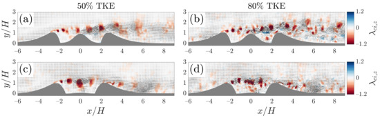 Figure 16a,b), a trail of vortices, clearly noted as regions of elevated swirling strength magnitude, emanates from the upstream rim. The spacing between the vortices indicates that shedding of these structures occurs in a somewhat periodic fashion. As they move downstream, the vortices become larger and therefore have reduced rotational intensity. The wall-normal position of the vortices varies across the instantaneous velocity fields, indicating that this shear layer may undergo vertical flapping. This mechanism is enhanced downstream of the mound, and in the lee side, presumably due to the interaction between different shear layers. For example, the 80% TKE reconstruction suggests the entrainment of small turbulent vortices into the downstream intracrater region, impinging into the rim wall. In the offset planes, results show that diffusion and flapping are highly increased right after the shedding from the upstream rim, suggesting enhanced momentum exchange around the mound (