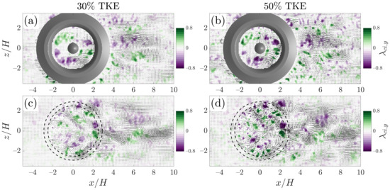 fields were calculated using the POD-filtered velocity with a number of modes corresponding to 50% of the TKE. Vortices were defined as regions where