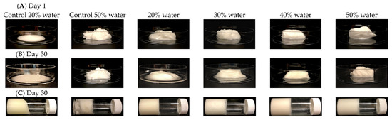 All emulsions showed a shear-thinning behavior where viscosity decreased with an increase in shear rate on day 1 and day 30 (Figure 2B,C). Control emulsions with 20 wt.% water showed the lowest viscosity trend with shear, which began with a low-shear plateau at 13.2 ± 1.7 Pa·s at 0.01 s−1 and decreased to at 0.1 ± 0.01 Pa·s at the end of the run at 100 s−1 (Figure 2B). However, control emulsions with 50 wt.% water showed an initial viscosity higher than all emulsions at 0.01 s−1, which showed a slightly irregular viscosity curve as a function of shear than all other emulsions. Such behavior could be related to their uneven texture observed in the Petri dish (Figure 1A). LMP emulsions with 20 wt.% water exhibited an initial viscosity significantly higher (137.05 ± 25.02 Pa·s) compared to control 20 wt.% water emulsions. There was not much difference in the viscosity trend of other LMP emulsions. In contrast to control emulsions with 50 wt.% water, all of the LMP emulsions showed a brief low-shear viscosity plateau, which indicates their Newtonian fluid-like behavior at a very low shear rate.