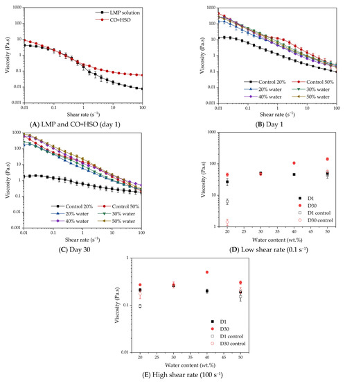 Apparent viscosity of 1.5 wt.% LMP solution and 7 wt.% HSO in canola oil on day 1 (A). Viscosity as a function of shear rate for water-in-oil emulsions with different water contents of 20, 30, 40, and 50 wt.%, prepared with and without LMP, GMO, and HSO on day 1 (B) and day 30 (C). Apparent viscosity of water-in-oil emulsions with different water contents of 20, 30, 40, and 50 wt.%, prepared with and without LMP, GMO, and HSO on day 1 and day 30, at low (0.1 s−1) shear rate (D) and at high (100 s−1) shear rate (E). Note the difference in y-axis scales due to the variation in shear rates.