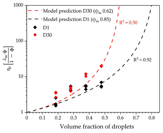 We found that a weighted viscosity ratio (λw) of dispersed (ηd) to continuous phase (ηc) could be more successfully used as a correction to the hard-sphere model proposed in Equation (1). The λw can be defined as the ratio ηd ϕ/ηc (1–ϕ). The proposed equation becomes: