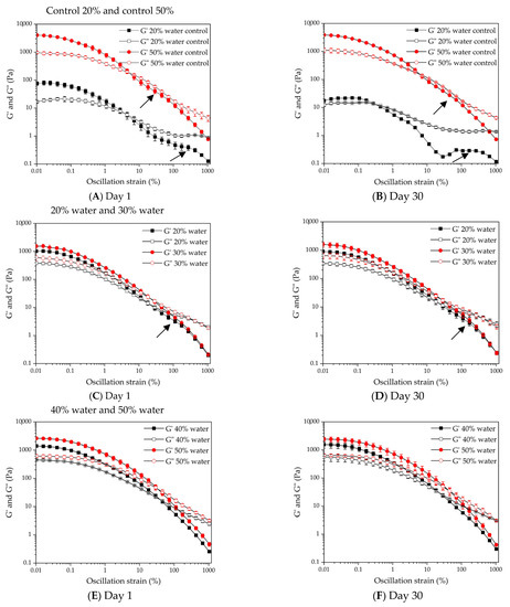 Storage (G′) and loss moduli (G′′) as a function of oscillation strain for water-in-oil emulsions with water contents from 20 to 50 wt.% and 1.5 wt.% LMP in the aqueous phase. Control emulsions were made without LMP in the aqueous phase. Data collected on day 1 (A,C,E) and day 30 (B,D,F) are shown for control emulsions (A,B), 20 and 30 wt.% water emulsions (C,D), and 40 and 50 wt.% water emulsions (E,F). The arrows in some figures indicate peaks in G′.