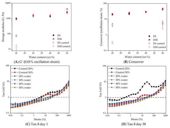 The crossover strain in rheology is defined as the strain required for gel breakdown, where G’ = G’’ (Figure 5B). Control emulsions with 20 and 50 wt.% water showed the lowest crossover on day 1 (p > 0.05), which could be due to the absence of LMP, leading to droplet destabilization. After 30 days, the crossover of 20 wt.% water control emulsions further decreased, while no change was observed for 50 wt.% water. Such drop in crossover strain for control 20 wt.% water emulsions could be due to water droplet destabilization-induced flow (visual observation in Figure 1B,C). LMP emulsions’ crossover strain increased with an increase in water content and was higher than the control emulsions’ crossover strain. Higher water content led to more droplet aggregation and packing, which in turn required higher force in order to break down the gel structure. The presence of LMP also led to LMP–GMO interaction at the interface, which further enhanced the droplet–droplet interaction and, hence, the force required to break the gel structure. After 30 days, no significant change in crossover strain was observed, indicating an unchanged emulsion structure.