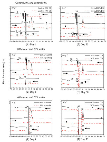 DSC freeze/thaw thermograms of water-in-oil emulsions under aging (on day 1 and day 30) for control emulsions with 20 and 50 wt.% water without LMP (A,B) and 20, 30, (C,D) 40, and 50 wt.% (E,F) water emulsions with LMP. Samples were cooled from 25 °C to −70 °C, and then heated to 70 °C, followed by a second cooling to −70 °C, at a rate of 5 °C/min. Arrows indicate the direction of the temperature cycle. Important peaks are identified with numbers and are discussed in the text.