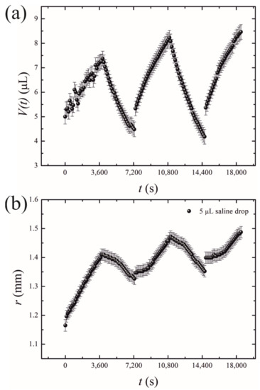- In the long-time experiments, the stage of growth continued for . During this time, the droplet volume increased from 5 µL to 30 µL. Afterwards, the chamber was opened, as shown in Figure 2 and Video S1 and the droplet was evaporated during Increasing the evaporation time scale gave rise to the formation of the NaCl crystals in the vicinity of the triple line as shown in Figure 2. At this stage, the volume of the droplet was decreased, and the triple line retracted. We performed cycles of the long-time osmotic growth/evaporation of a droplet and observed that the process is reversible. Statistical scattering of the contact radius and volume of the droplet within growth/evaporation cycles were established as ±0.05 mm and ±0.3 μL, respectively.