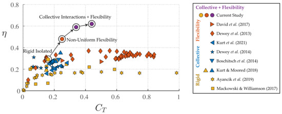 The current study charts a path to exceeding 60% collective efficiency while pitching foil studies typically never break 40% efficiency. The markers are colored yellow for single rigid foil studies, blue for studies of a pair of interacting rigid foils, red for single flexible foil studies, and purple for our current study where we examine a pair of interacting flexible foils. Not all data was extracted from each study. The highest efficiency cases were chosen for two-dimensional foils and three-dimensional foils with [13,19,20,25,32,33,34,35].