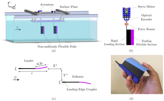 Two identical hydrofoils were used in a leader-follower arrangement. They had a rectangular planform shape with a chord length of m, a span length of m, and a thickness-to-chord ratio of . The foils were fabricated to have a step change in their flexibility from a rigid leading section to a flexible trailing section (Figure 2b,d) producing a simple non-uniform distribution of flexibility [16,17]. The foils rigid leading sections composed of the chord length and were constructed of NACA 0012 shaped couplers at the leading edge with carbon fiber sheets embedded into the couplers. The foils flexible trailing sections composed of the chord length and were fabricated from polyester plastic shim stock adhered to the rigid sections (Figure 2c). The bending stiffness of the flexible trailing section was N m. The flexion ratio, (ratio of the rigid section length to the total length), and the bending stiffness of the flexible section were chosen to match optimal properties for maximizing the efficiency from unpublished, in-preparation research [18].