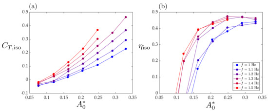 (a) Thrust coefficient and (b) efficiency as a function of the dimensionless amplitude, , for different pitching frequencies, f. The lowest to the highest frequencies within the range of are mapped from blue to red.