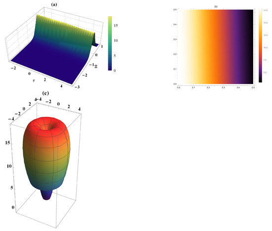 Solitary wave solution of Equation (16) in (a) three–dimension, (b) density and (c) spherical plot three–dimensional for .