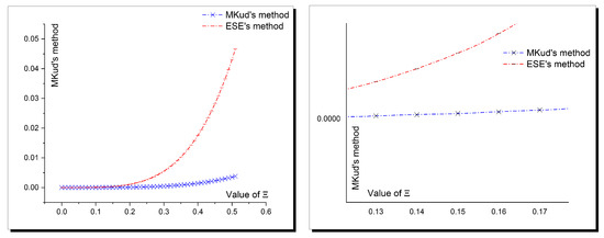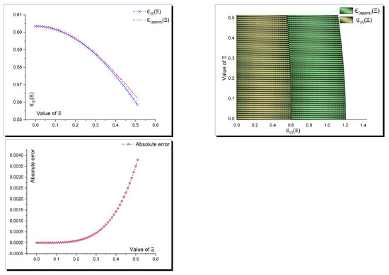 Checking the accuracy of the obtained exact solutions of the equation along with ESE and MKud methods with respect to Equations (12) and (32) for , gets the following semi–analytical solutions;