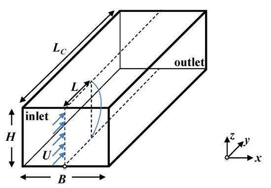The channel geometry is represented in Figure 1. A uniform velocity, U, is imposed at the inlet () of the microchannel, where all other velocity components and deviatoric stresses are set to zero. Vanishing streamwise gradients are applied to all variables at the outlet plane, except for the pressure, which is linearly extrapolated to the outlet from the two nearest upstream cells. The classical no-slip condition is imposed at the channel walls.