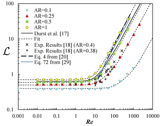 In order to estimate , simulations were conducted from small (creeping flow conditions) up to , covering the laminar regime. Note that for high AR the simulations were performed for lower values of , so that the flow stays laminar (see, e.g., [18]).