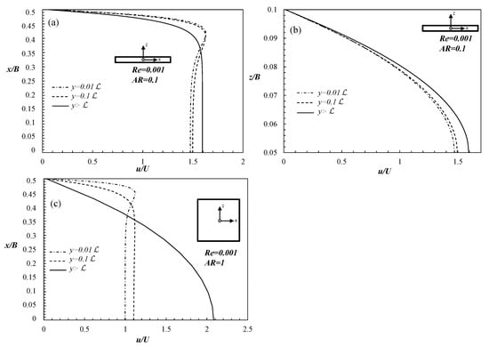 Figure 3a,c shows non-dimensional transverse profiles of streamwise velocity at various streamwise locations y for (creeping flow) and two different aspect ratios and . Figure 4a,c shows the corresponding profiles but considering inertial effects at . The profiles are presented only for half of the channel due to the flow symmetry.