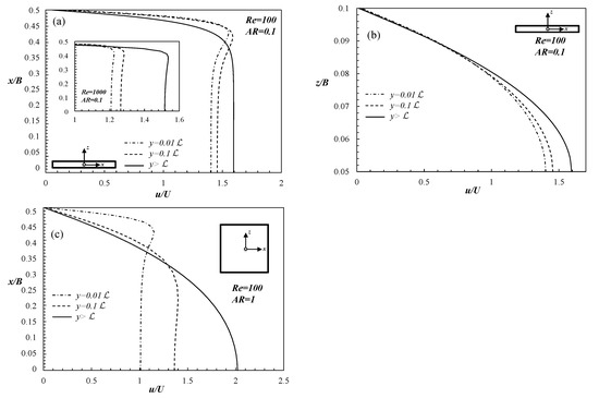 Comparing Figure 3a,c, we observe that for the lower aspect ratio the overshoot is more pronounced, possibly due to the restrictive no slip boundary condition of the top and bottom walls that are much closer to the center than the side walls. Figure 3b shows the evolution of the non-dimensional axial velocity component at several axial positions along the direction for the case of and (the results are qualitatively similar for other ). In this case, the left and right walls are far from the development region, and we have an almost 2D case, where a more parabolic profile is obtained.
