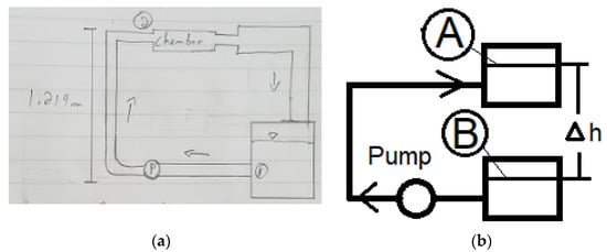 Alternatively, the major and minor losses could be estimated based on the possible materials and components to be used in the designs. This detail calculation process provides valuable realistic exercise for the students involved in this project. Table 1 shows list of pipes and channels, as well as estimated major head losses. The mean velocity for each section is estimated from the flowrate of 0.0135 m3/s based on the required flow speed of 60 cm/s. The major loss is defined as and the friction factor for each section is determined from the Moody chart based on the associated Reynolds number and given roughness factors of the pipes [42,43,44,45]. Due to the short pipes involved in this design, this calculation renders net head much less than 1 m, well below the estimated head mentioned before. As expected, the required head is dominated by the height of the water column that must be overcome.