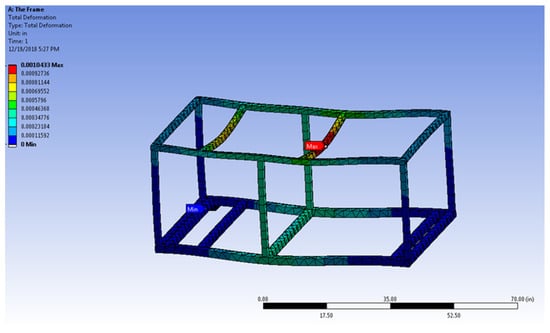 Additionally, a dynamic modal analysis was performed using ANSYS (ANSYS Inc., Canonsburg, PA, USA) to check the mode shapes and natural frequencies of the supporting system. Outcomes from the modal analysis indicate possible resonance and amplification of deformation when the pump’s operating frequency is in the vicinity of the natural frequency of the support system. Due to the simple vibration load that is being considered, the modal analysis was set to find only the first six (6) natural frequencies. The resulting natural frequencies of the frame are presented in Table 6. These natural frequencies were used in harmonic response analysis to determine the maximum deflection of the frame. The maximum deformation of 5.51 mm occurs for Mode 5 corresponding to the frequency of 73 Hz. Other frequencies result in maximum deformation of less than 2.54 mm. The first three (3) modes correspond to the operating frequencies of the pump of 0 to 60 Hz. Nevertheless, due to the rigidity of the structure, the amplification was found to be very minimal. The outcome suggests that the structure and material selection for this flow tank is sufficiently strong to sustain the vibration load by the pump. The study also shows that only the first 3 (or at most 4) modes need to be considered as the maximum operating frequency of the pump is only 60 Hz. Table 6 shows the six (6) first natural frequencies of the supporting frame. The maximum deformation from the harmonic analysis, based on the given static load, is also shown in this table. A maximum deformation of 5.08 mm can potentially occur for Mode 5, corresponding to ~73 Hz. Other modes show maximum deformation of less than 2.54 mm.