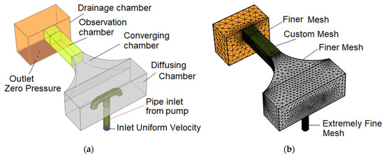 Shown in Figure 4 panel (b), results of Partial Refinement strategy where high mesh density (“Extremely fine mesh”) is applied on the observation chamber, pipe inlet, and T-junction domains. The remaining domains are discretized using “Finer” mesh. The minimum and maximum element sizes employed in the observation chamber are 5 mm and 15 mm, respectively. The application would result in at least 10 computation nodes across the 15 cm wide observation chamber, which should be enough for accuracy.