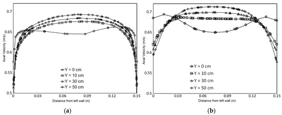 Axial velocity profiles obtained at the horizontal mid-section of the observation chamber taken at different distances Y from the entrance obtained using (a) Global Mesh refinement and using “Normal” scheme (Model B4) and (b) Partial Refinement method (Model F).