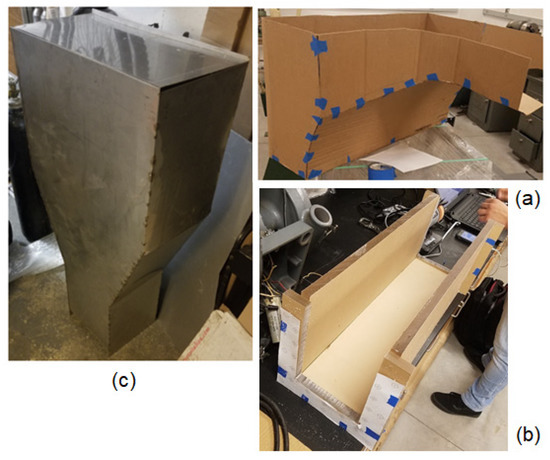Panel (a) shows the cardboard model used in the making of the diffusion channel. Panel (b) shows the observation chamber being assembled, and panel (c) shows the final product of drainage chamber before being assembled into the main body.