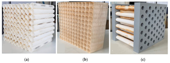 Models of flow straightener used in the flow experimentation—(a) Model 1 is made of cut PVC pipes that are glued together in parallel arrangement. (b) Model 2 is a full 3D-printed apparatus designed in SolidWorks. (c) Model 3 is an assembly of PVC pipes fitted into 3D-printed block with holes.