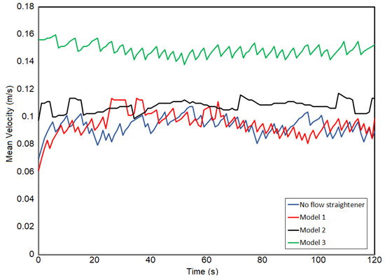 This figure shows mean velocities from the flowmeter for various flow straightener models taken for a period of 120 s when the pump speed is 10 Hz. The blue line is the velocity of water flow without flow straightener. The velocity after the installation of Model 2 shows stability compared to other models.