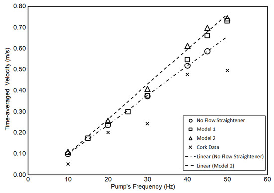 Time-averaged (over the steady state period) water flow velocity obtained from the flow meter for various pump’s frequencies are presented in Figure 13. The data points are labeled using white circles (no flow straightener), white square (Model 1 of flow straightener), and white triangle (Model 2 of flow straightener). A linear relationship of