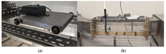 The figure on the left panel (a) shows the force sensor supported by the aluminum platform (sled) with its wheels placed along the wall of the observation chamber. The panel (b) on the right shows the complete setup of the drag sensor secured on the observation chamber with the flow meter placed upstream to allow simultaneous measurements of flow speed and drag forces. The water flows from left to right.