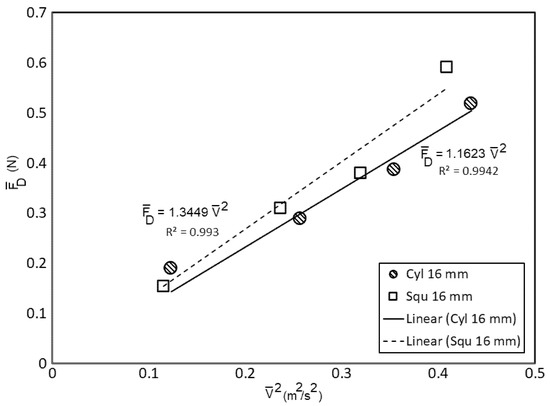 Alternatively, the drag coefficients can be obtained by first plotting the drag force data against the square of the time-averaged speed, as shown in Figure 20. Using standard linear regression analysis, the linear relationship between and can be obtained. For the presented samples, the following relations are obtained and for the cylinder bar and square bar samples, respectively. The high values for the two samples indicate a strong fit in the regression process. It also indicates that the linear relation is appropriate, as the is expected to be constant in the applied range of Reynolds numbers. Note that the zero intercept in this case is not automatic, and it must be enforced as the zero force should be correlated with zero velocity. Eventually, the drag coefficients can be calculated from the gradients of the lines using the following formulation, which can be derived from (4)