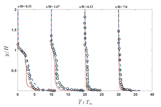 Mean temperature profiles in various streamwise locations. IDDES (red dotted line), LES (blue dashed line), and corresponding experiment (circles).
