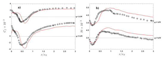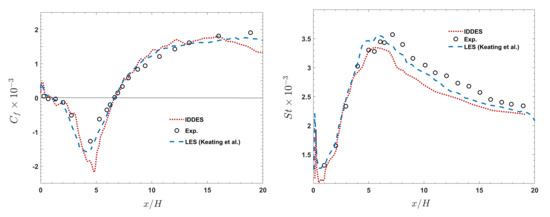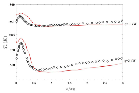 It was discussed that the IDDES model suffers from the underprediction of the skin friction for the case of the wall with a mild heat transfer rate (first configuration). The simulations of the cases with an intense wall heat transfer are performed for two different wall heat fluxes, and 3 kW/m. The evolution in the streamwise direction displayed in Figure 11a reveals a very interesting dependence on the heat flux level supplied. Directly comparing the mean and St (Figure 11b) with the experimental data reveals that as the heat flux increases, the IDDES model declines to predict the accurate . The St prediction also follows the same trend. However, it is apparent that the strong temperature variation does not significantly influence the reattachment length. Figure 12 shows that the trend of the wall temperature variations agree very well with the experimental reference data. The position of the peaks of the temperature is well predicted by the IDDES model. It can be seen that the temperature is overpredicted by the computational results in the separation zone for both cases; however, it suffers from an underprediction in the recovery region. The overall prediction is quite acceptable for the case of the wall with the lower heat transfer rate ( kW/m).