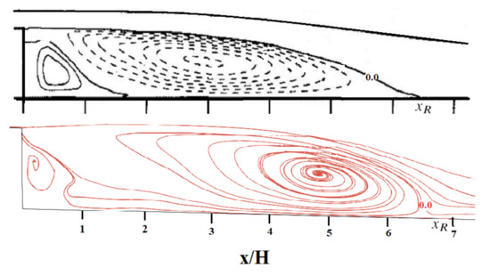 Mean streamlines obtained experimentally, recreated from [29] (upper) and applying the IDDES model (lower) for the isothermal wall. (Upper figure reproduced with permission from [16], published by American Society of Mechanical Engineers 2010).