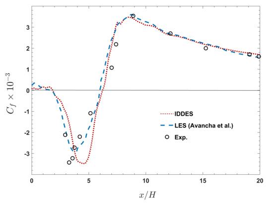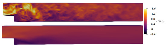 The results of the reattachment length obtained by several computational methods and experiment are summarized in Table 1. The IDDES model slightly overpredicts the mean reattachment point compared to the experimental and LES results. The iso-surface of Q colored with the instantaneous x-velocity is shown in Figure 3. The turbulence coherent Q-criterion, was originally introduced by Jeong and Hussain [34] to visualize a vortex, and it is defined as where and S are rotation and strain rate tensors, respectively. The coherent structures in the undisturbed boundary layer present classic streamwise elongated hairpin vortices. The Kelvin–Helmholtz instability at the edge of the step breaks the upcoming longitudinal structures. Near the reattachment line, some large-scale coherent structures in the boundary layer can be identified. In the recovery region, detached structures from the mixing layer are observed.