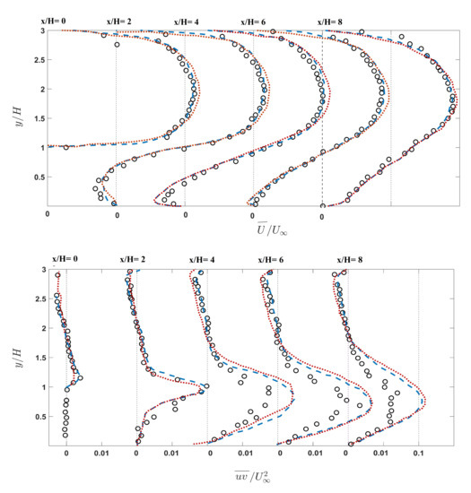 The mean velocity and Reynolds shear stress in various streamwise location for the isothermal wall case. IDDES (red dotted line), LES (blue dashed line), and corresponding experiment (circles).