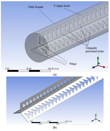 (a): Physical model of triangular perforated Y-shaped insert inside a circular tube; (b) triangular perforated Y-shaped insert for PI = 30%.