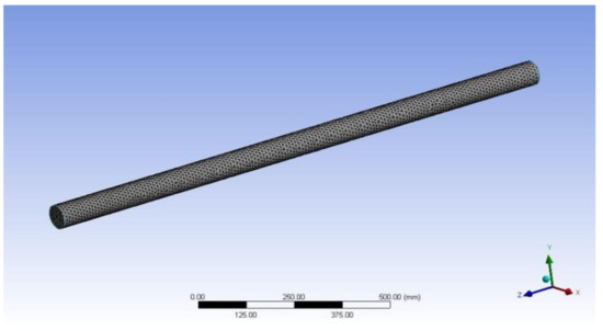 The grid independence test has been conducted for determining the number of elements presented in Table 2. The deviation for 15, 24, 877 elements in the Nusselt number was 0.2% and the friction factor was 4.59%, which is satisfactory in terms of accuracy for the simulation. Hence, further computational analysis was performed, taking 15, 24, 877 elements. The meshing of the insert with triangular perforation is shown in Figure 2.