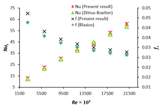 The obtained results are presented in Figure 3. It can be seen in the figure that the obtained values of the Nusselt number and friction factor have shown good agreement with the experimental results with a deviation of ±4% and ±6%, respectively.