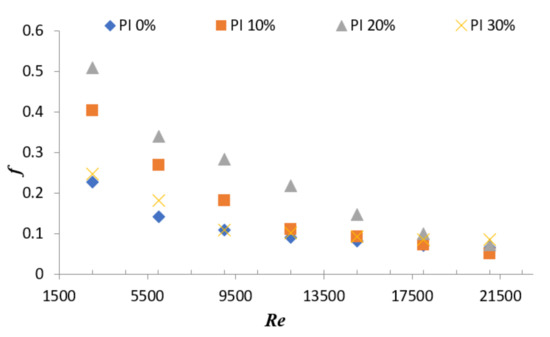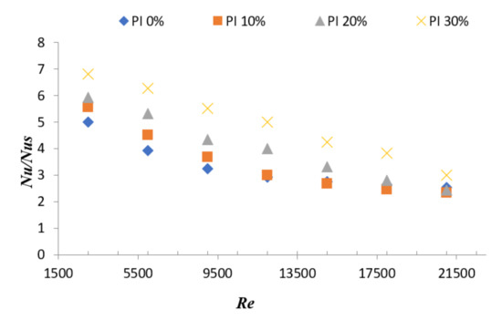 - The Nu varies between 60 to 210 with an increase in PI from 0% to 30% under the range of Reynolds number between 3000 and 21,000, whereas the friction factor varies between 0.05 and 0.51 with an increase in PI from 0% to 30% under the range of Reynolds number between 3000 and 21,000.