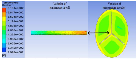 The temperature distribution created at the wall of tube due to Y-shaped triangular perforated insert and variation of temperature at the outlet are shown in Figure 6.