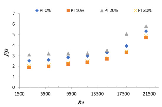 The friction factor alters the thermal performance of HE. It is expected that the higher the friction factor, the lower the performance of HE. In case of PI = 20%, the friction factor was found higher at the Reynolds number between 3000 and 21,000. This is similar in case of the 10% perforation, the reason being the higher friction factor due to hole variation in the perforation of Y-shaped insert. Variation of f with Re is presented in Figure 7; however, comparison of f (rough tube) with respect to fs (smooth tube) is shown in Figure 8, in which a similar nature is shown for 20% perforation.