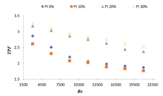 The maximum thermal performance (TPF) was found to be 3.25 in the case of the 30% perforation index at Reynolds number 3000. It can be noticed in Figure 9, that lower Re results in better heat transmission performance. This happens because at higher velocities, the test section undergoes a higher pressure drop; hence, the friction factor increases and thermal performance decreases.