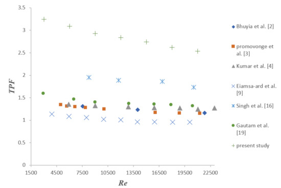 In Figure 10, comparison of the present study geometry—a Y-shaped insert with triangular perforation—with previously published works has been carried out. The comparison is made in the same range of Reynolds number. The research works considered are: Bhuyia et al. [2], using double counter-twisted tape inserts; Promvonge et al. [3], using inclined vortex rings; Kumar et al. [4], using circular rings; Eiamsa-ard et al. [9], using a double-sided delta wing tape insert; Singh et al. [16], using a solid-hollow circular disk with rectangular winglets; and Gautam at al. [19], using a perforated triple-wing vortex generator. It can be seen from Figure 10, that the Y-shaped insert with triangular perforation provides the highest thermal performance factor among all others set of geometries of previous researchers.