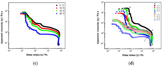 Viscous flow tests were carried out at a steady state, analyzing the variation of apparent viscosity (defined by the relationship between shear stress and shear rate) within a range of shear rates between 0.001 and 1000 s−1 at 5, 10, 15, and 25 °C. Small-amplitude oscillatory shear (SAOS) tests were performed to obtain viscoelastic responses. In this way, stress sweeps were carried out at a frequency of 1 Hz, applying an ascending series of stress values from 0.001 to 1000 Pa at 5 °C to determine the linear viscoelasticity interval. Frequency sweeps were performed to obtain the mechanical spectrum using a stress value within the linear viscoelastic range in a frequency range between 10−2 and 102 rad·s−1. The data recorded included the storage modulus (), which provided the elastic component; the loss modulus (), which was related to the viscous components of the material; and the loss tangent (Tan δ), which was the ratio and provided the ratio of elastic to the viscous response of the material under consideration.