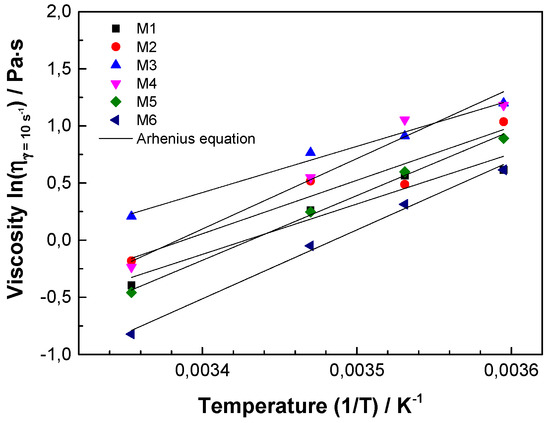where is the viscosity at 10 s−1 (), is a constant describing the viscosity coefficient at a reference temperature (Pa·s), is the activation energy (J·mol−1), R is the gas constant (8.3144 J·mol−1·K−1), and T (K) the temperature [54]. The activation energy () is an important parameter of kinetic studies. The calculation was obtained by plotting the ln ) against 1/T (Figure 3).