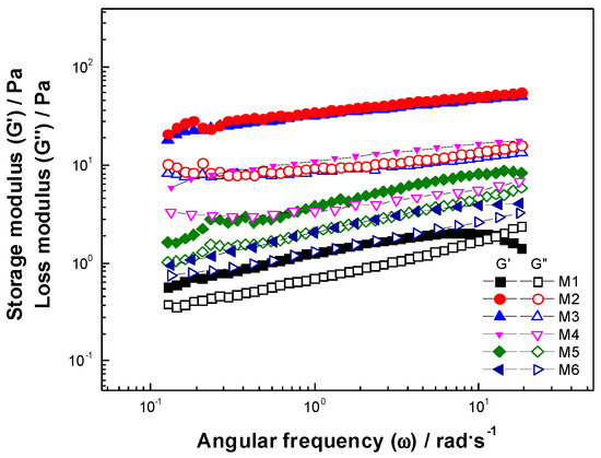 For all samples, different linear and nonlinear viscoelastic regions could be observed. As shown in Table 6, in the linear viscoelastic regions, were higher than remaining constant indicated that the yogurt behaved like a viscoelastic solid. The samples prepared without stabilizer (M1) and with XG or HBSS alone (M2 and M6) did not present significative differences (p < 0.05) in , and the interaction of XG–HBSS (M3 and M4) presented higher , values, rationed with the crosslinking of the molecules.
